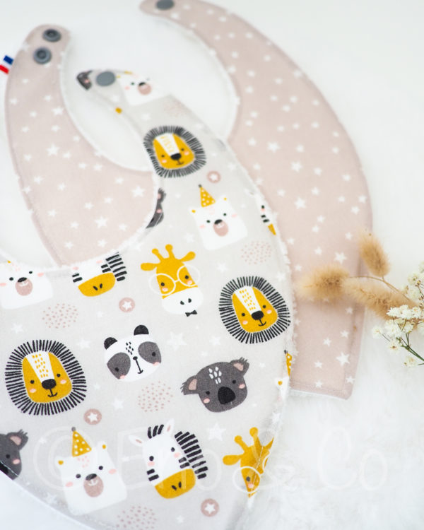 Les bavoirs ferment à l’aide de 2 pressions en résine pour ajuster la taille au cou de bébé.