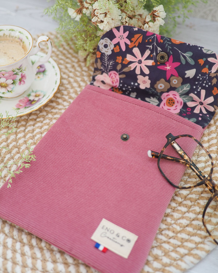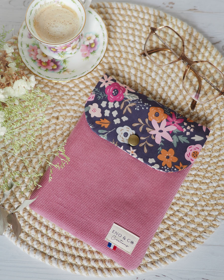 En plus de son esthétique, cette pochette offre un contraste de matières très agréable. Le corps de la housse utilise un velours côtelé vieux rose de haute qualité. En revanche, le rabat est confectionné dans un coton aux motifs floraux incroyables. Ainsi, chaque fois que vous prenez votre liseuse, vous profitez d’un accessoire textile unique et fait main.